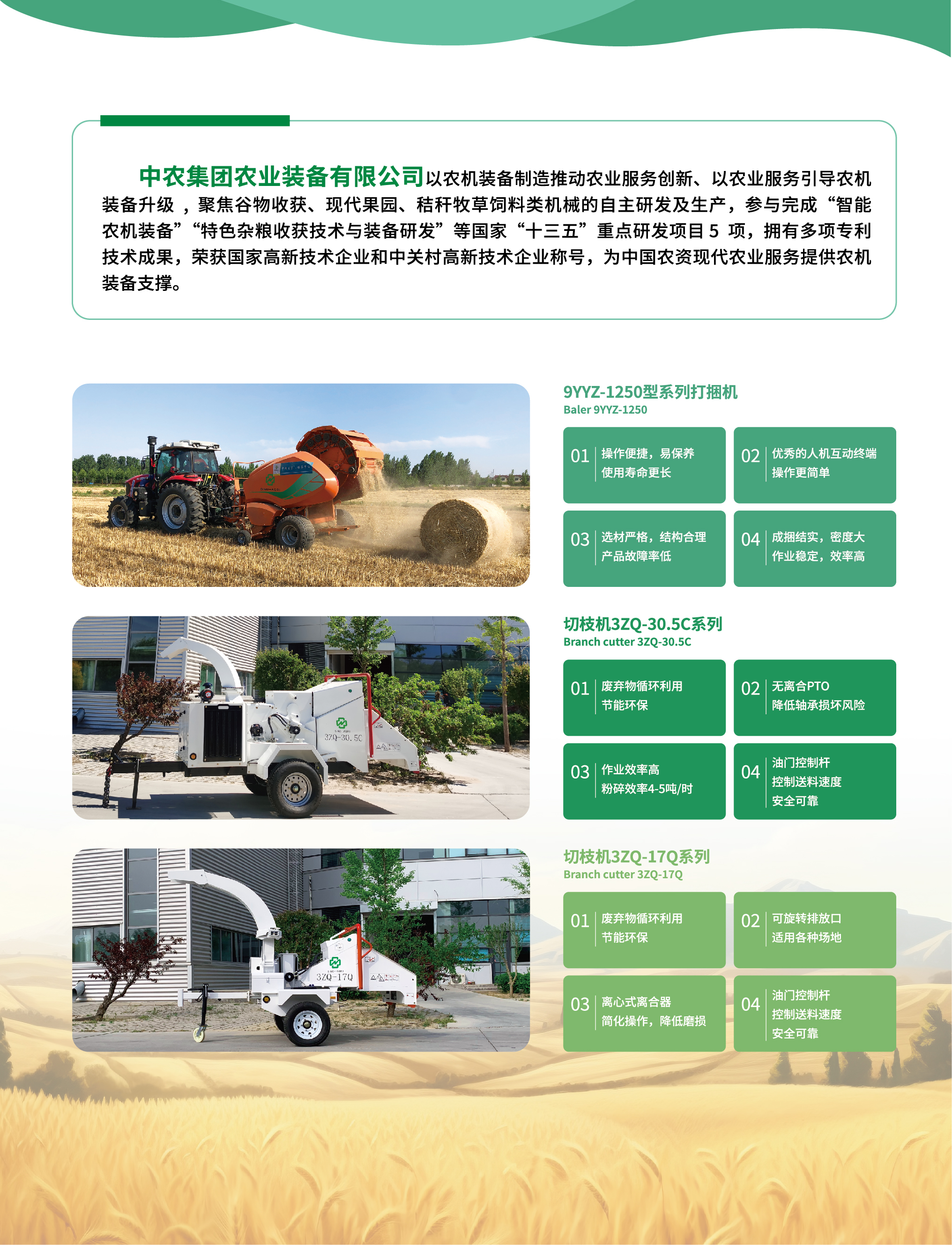中農裝備以農機裝備制造推動農業服務創新、以農業服務引導農機裝備升級,聚焦谷物收獲、現代果園、秸稈牧草飼料類機械的自主研發及生產,參與完成“智能農機裝備”“特色雜糧收獲技術與裝備研發”等國家“十三五”重點研發項目5項,擁有多項專利技術成果,榮獲全國高新技術企業和中關村高新技術企業稱號,為“中國農資”現代農業服務提供農機裝備支撐。