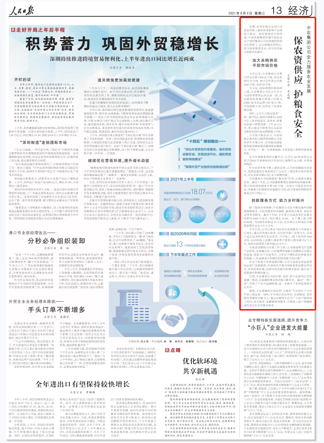 8月4日,《人民日報》第13版經(jīng)濟版刊發(fā)《中農(nóng)集團公司全力服務農(nóng)業(yè)發(fā)展 保農(nóng)資供應 護糧食安全》一文,報道了中農(nóng)集團全力保障農(nóng)資供應,助力國家糧食安全,切實肩負起為農(nóng)服務的重任。
