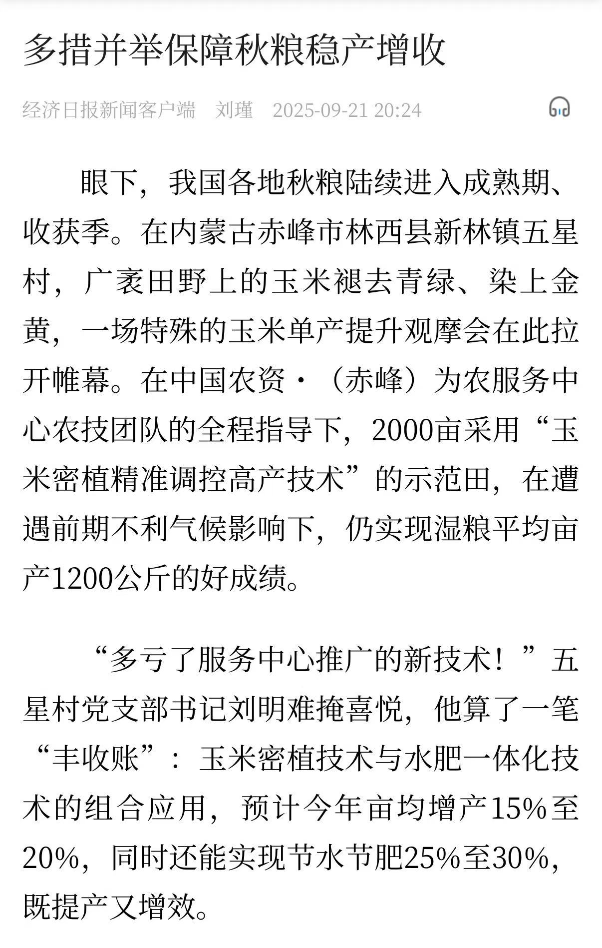 眼下,我國各地秋糧陸續進入成熟期、收獲季。在內蒙古赤峰市林西縣新林鎮五星村,廣袤田野上的玉米褪去青綠、染上金黃,一場特殊的玉米單產提升觀摩會在此拉開帷幕。在中國農資?(赤峰)為農服務中心農技團隊的全程指導下,2000畝采用“玉米密植精準調控高產技術”的示范田,在遭遇前期不利氣候影響下,仍實現濕糧平均畝產1200公斤的好成績。