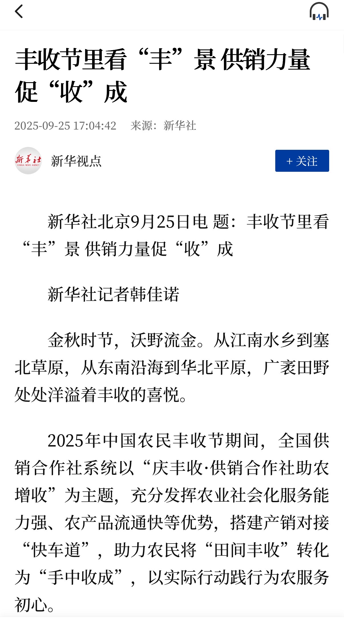 豐收節里話豐收,廣袤田野映初心。供銷合作社搭起城鄉流通橋梁,以實際行動助力農業強、農村美、農民富,讓豐收的成色更足,讓農民的笑容更甜。